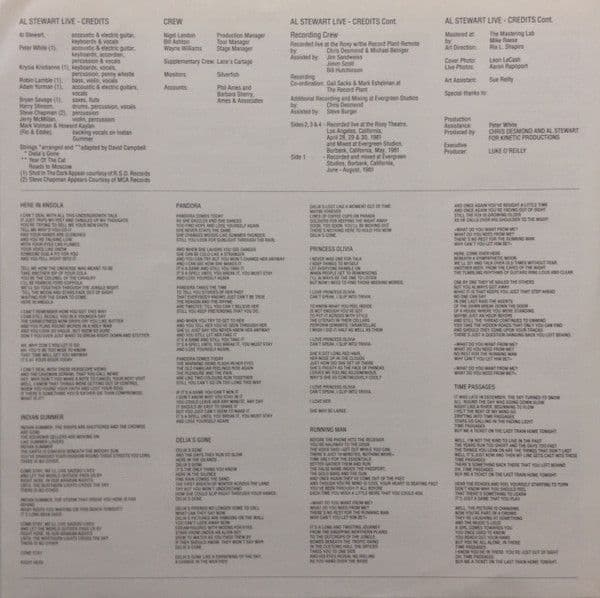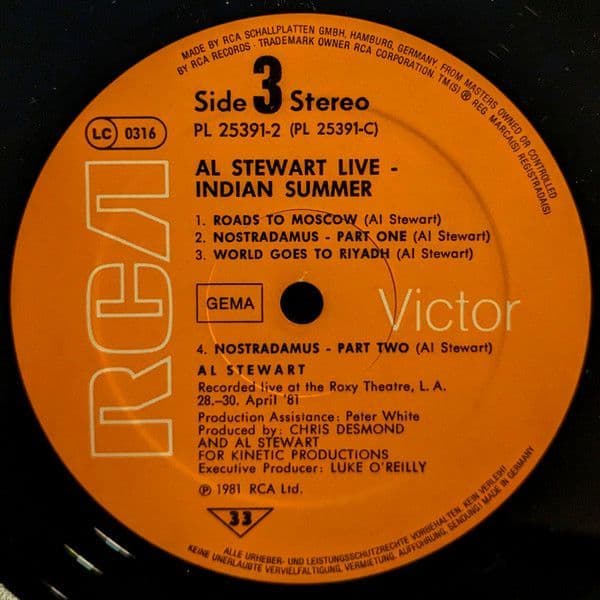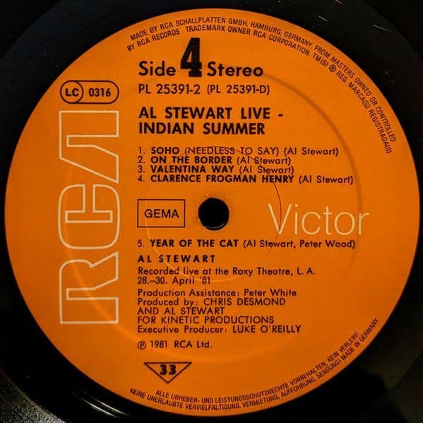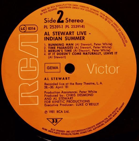 AL STEWART Live Indian Summer Vinyl Record LP German RCA 1981