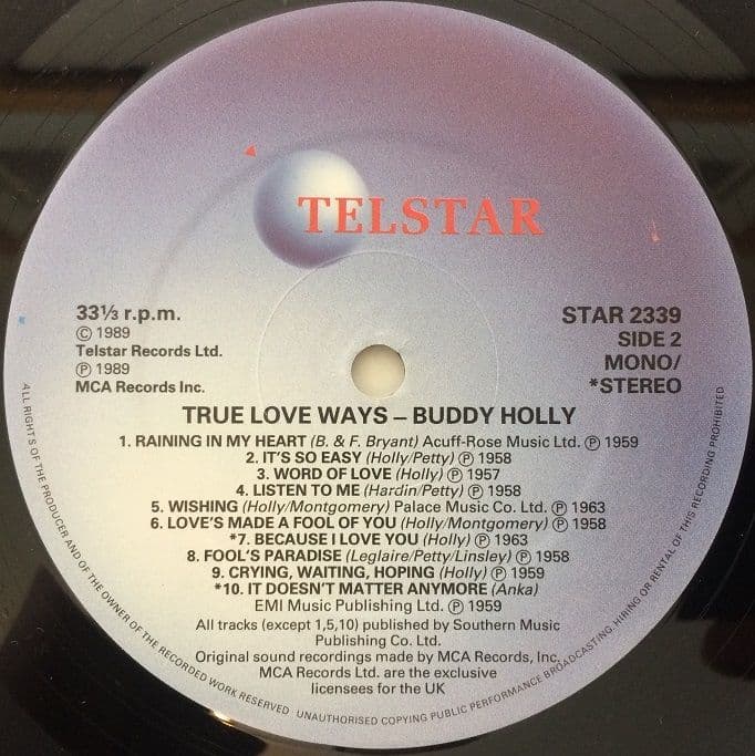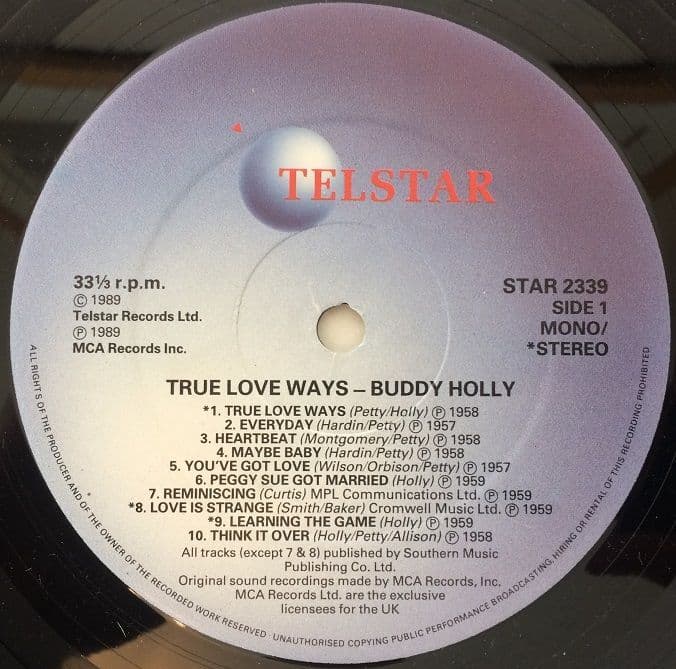 BUDDY HOLLY True Love Ways Vinyl Record LP Telstar 1989