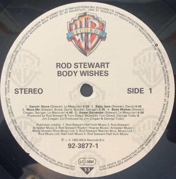 ROD STEWART Body Wishes Vinyl Record LP Warner Bros. 1983