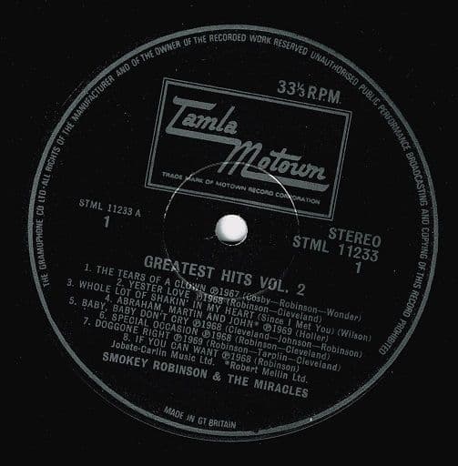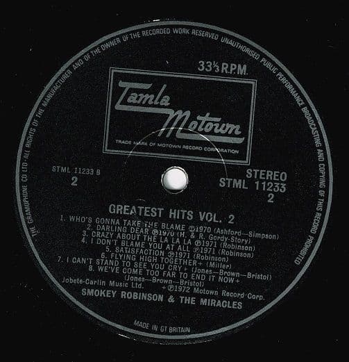 SMOKEY ROBINSON & THE MIRACLES Greatest Hits Vol. 2 Vinyl Record LP Tamla Motown 1973