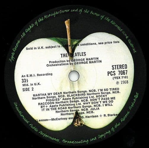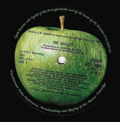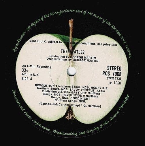 The vinyl itself bears the classic dark green Apple labels. Critical identifying marks for this 1968 stereo edition include the "Sold in U.K." subject-to-resale-price text and the "An E.M.I. Recording" credit. Sonically, the first-press matrices offer the original, raw stereo mix of the 30-track masterpiece, spanning from the hard-rocking "Helter Skelter" to the avant-garde "Revolution 9".