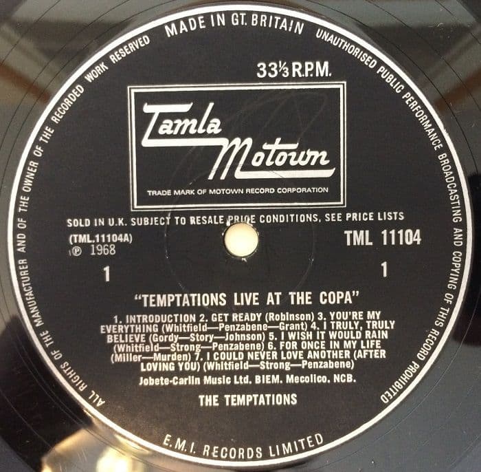 THE TEMPTATIONS Live At The Copa Vinyl Record LP Tamla Motown 1968