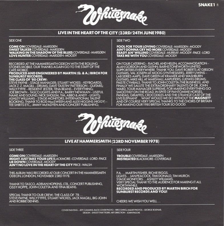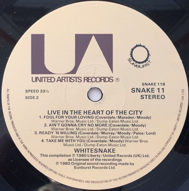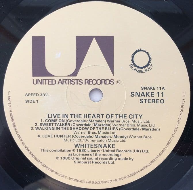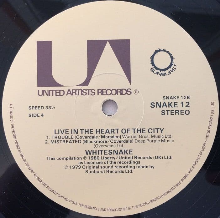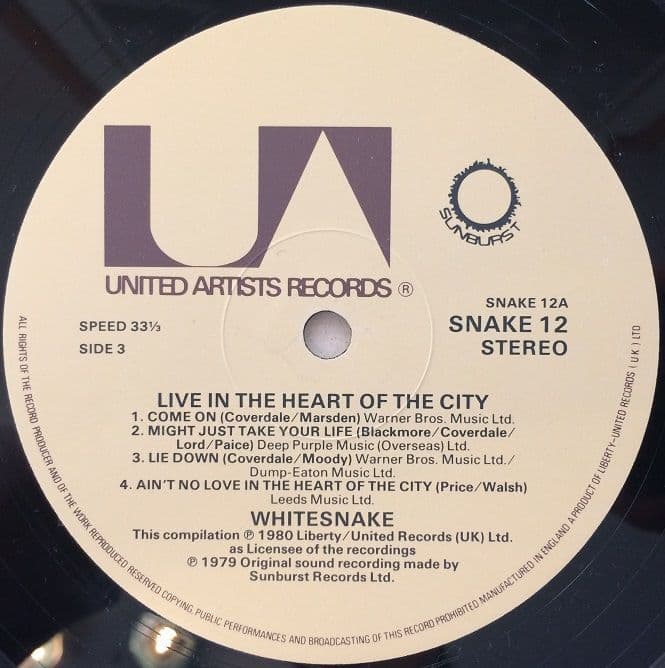 WHITESNAKE Live In The Heart Of The City Vinyl Record LP United Artists 1980