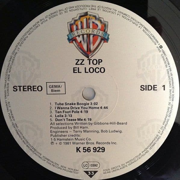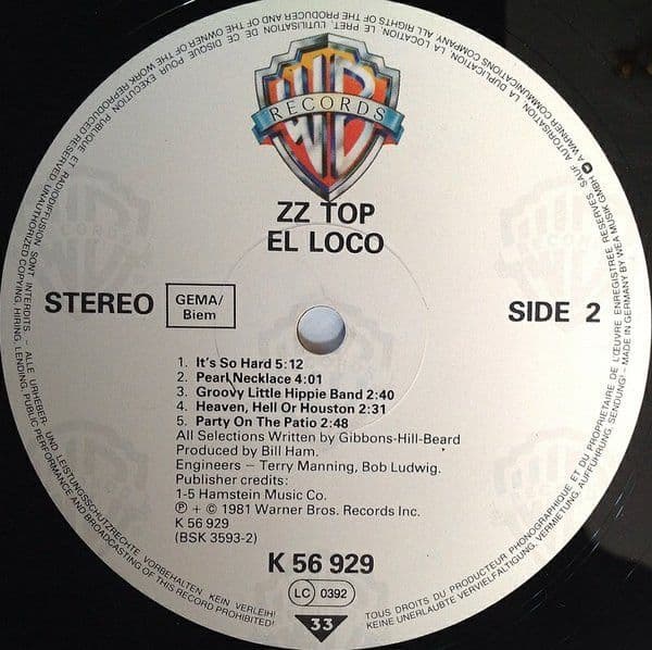 ZZ TOP El Loco Vinyl Record LP Warner Bros.